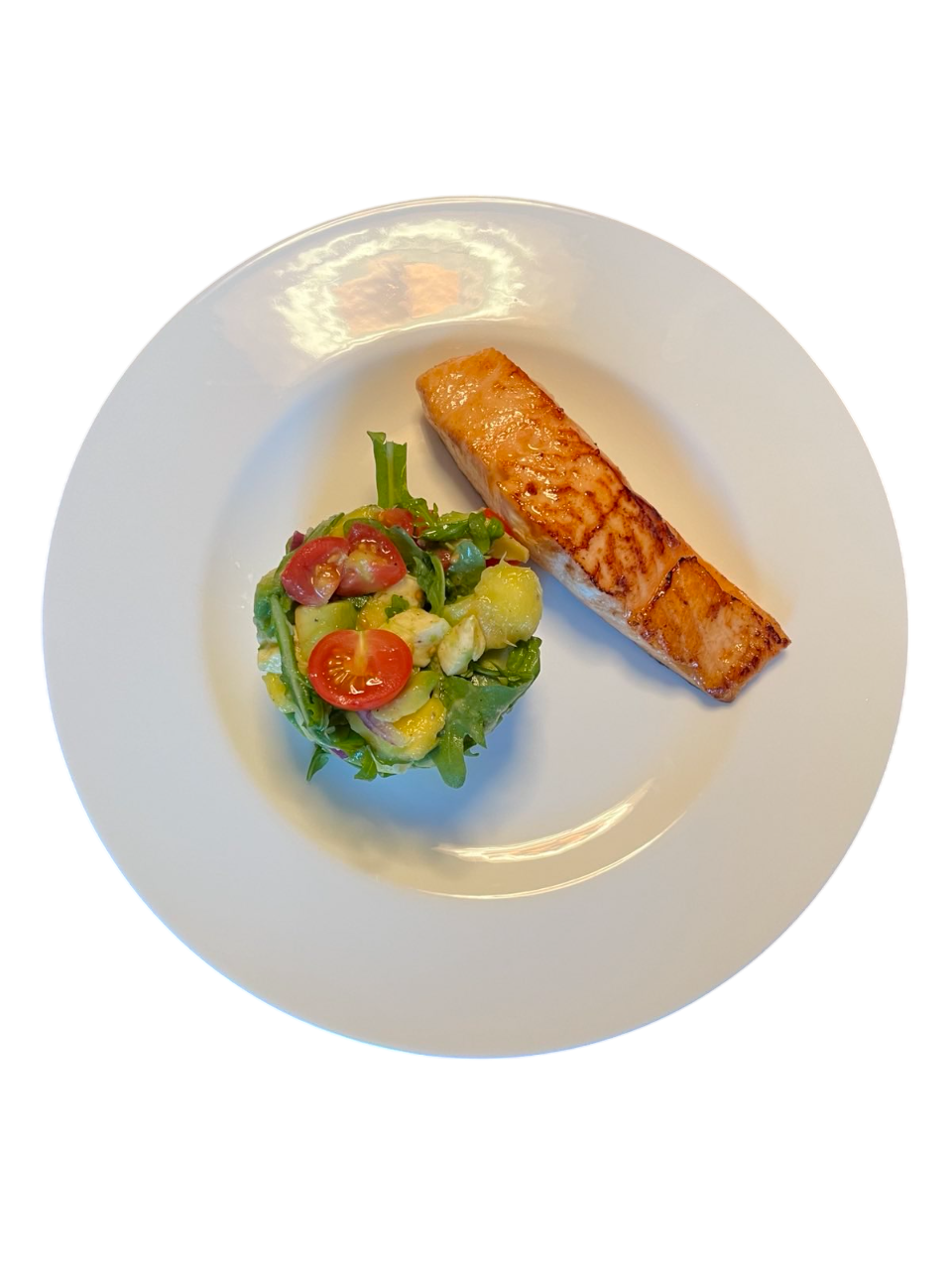 Lachs mit der Salsa anrichten. Dazu passt Baguette.