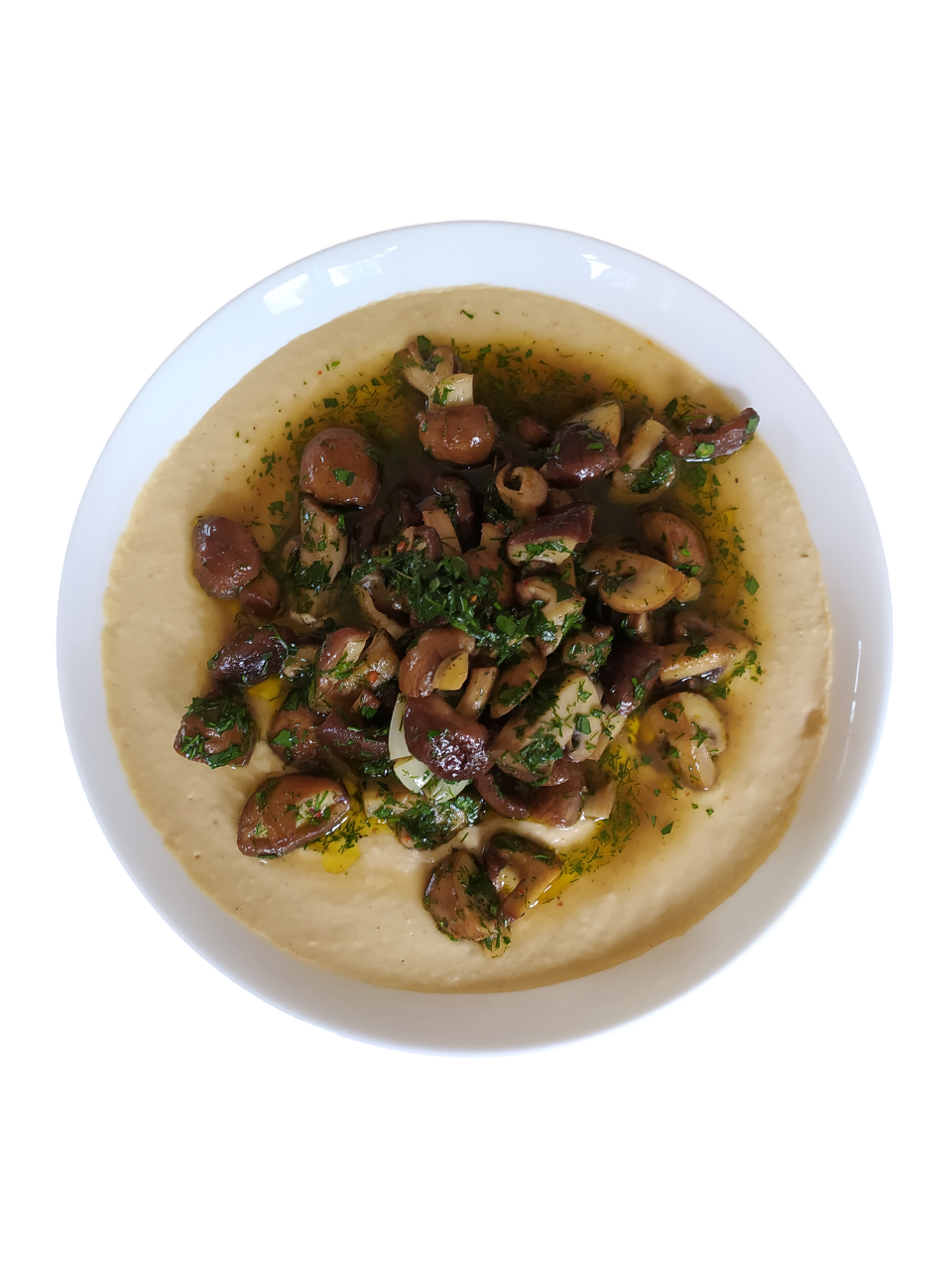 Jetzt den Humus in einen Teller geben. Die Pilze mit Dill und Petersilie mischen und darauf servieren.