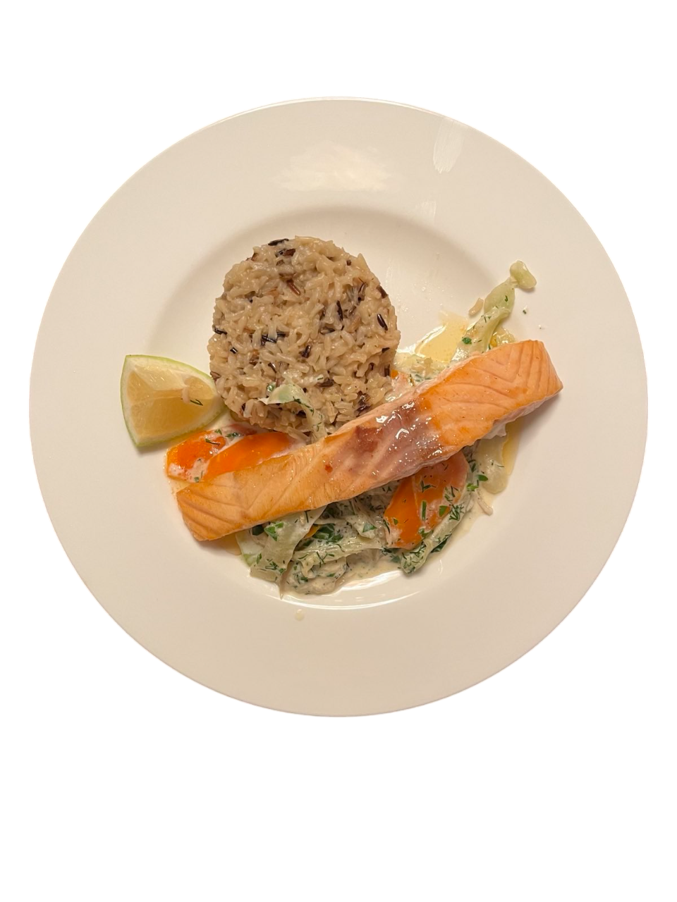 Den Reis nach Packungsanweisung kochen. Fenchel waschen, putzen und halbieren. Den festen Strunk in der Mitte entfernen und dann längs in ca. 1 cm breite Streifen schneiden. Die Karotten waschen, schälen und in 0,5 cm dicken Scheiben schneiden. Die Schalotten schälen und in dünne Scheiben schneiden. Petersilie und Dill waschen und fein hacken. Zitrone vierteln. 1 EL Öl in der Pfanne erwärmen. Die Schalotten ganz kurz andünsten, dann den Fenchel und die Karotten dazugeben. Alles anbraten und mit Salz und Pfeffer würzen. Die Sahne, das Créme Fraiche und die Kräuter dazugeben und für ca. 12 Minuten köcheln. Mit einer Prise Gemüsebrühe, Salz und Pfeffer abschmecken.